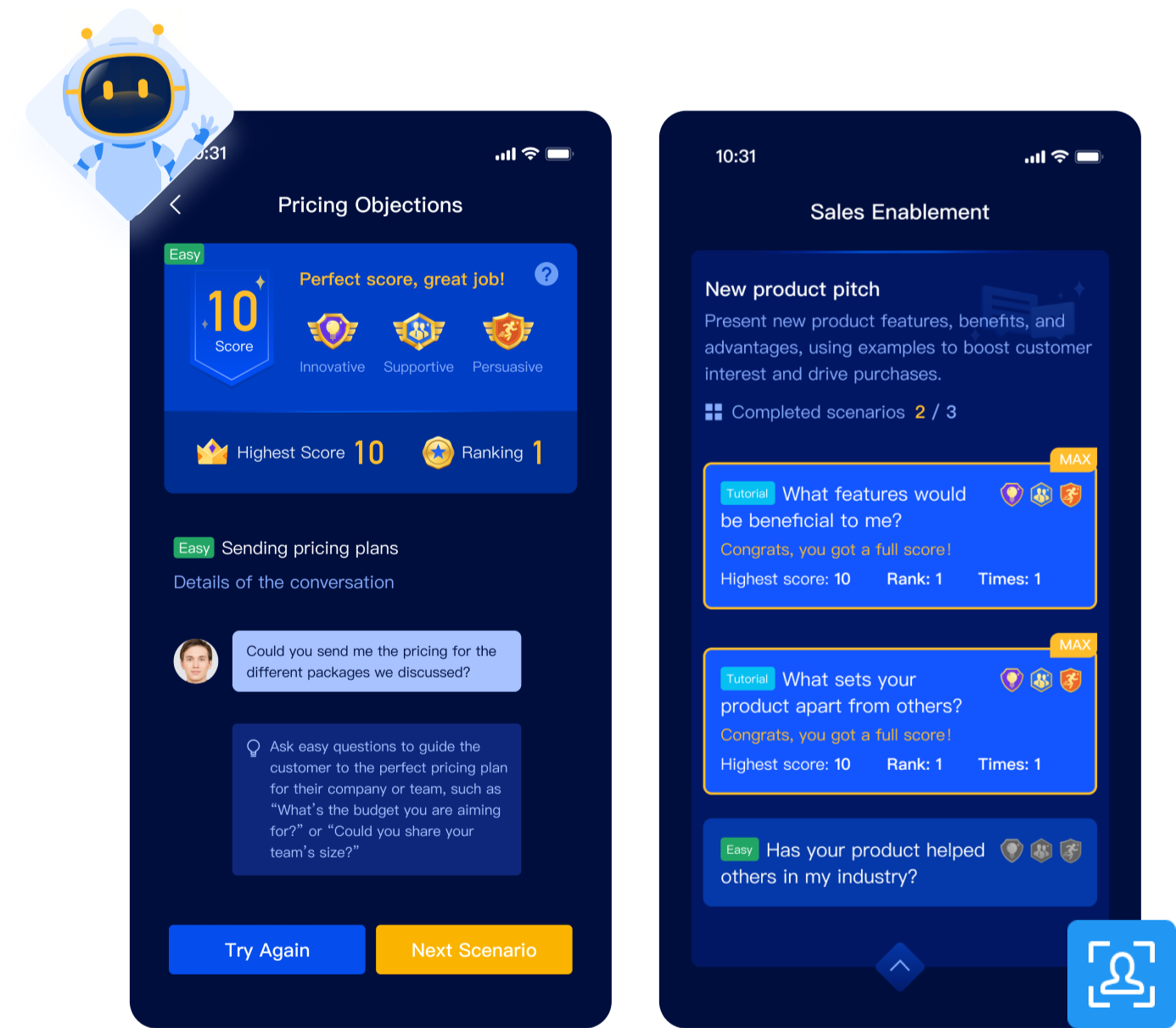 Leverage our AI-powered coaching tool to help sales teams practice at scale and deliver stellar presentations on product knowledge, FABs, and more in line with your industry’s best practices